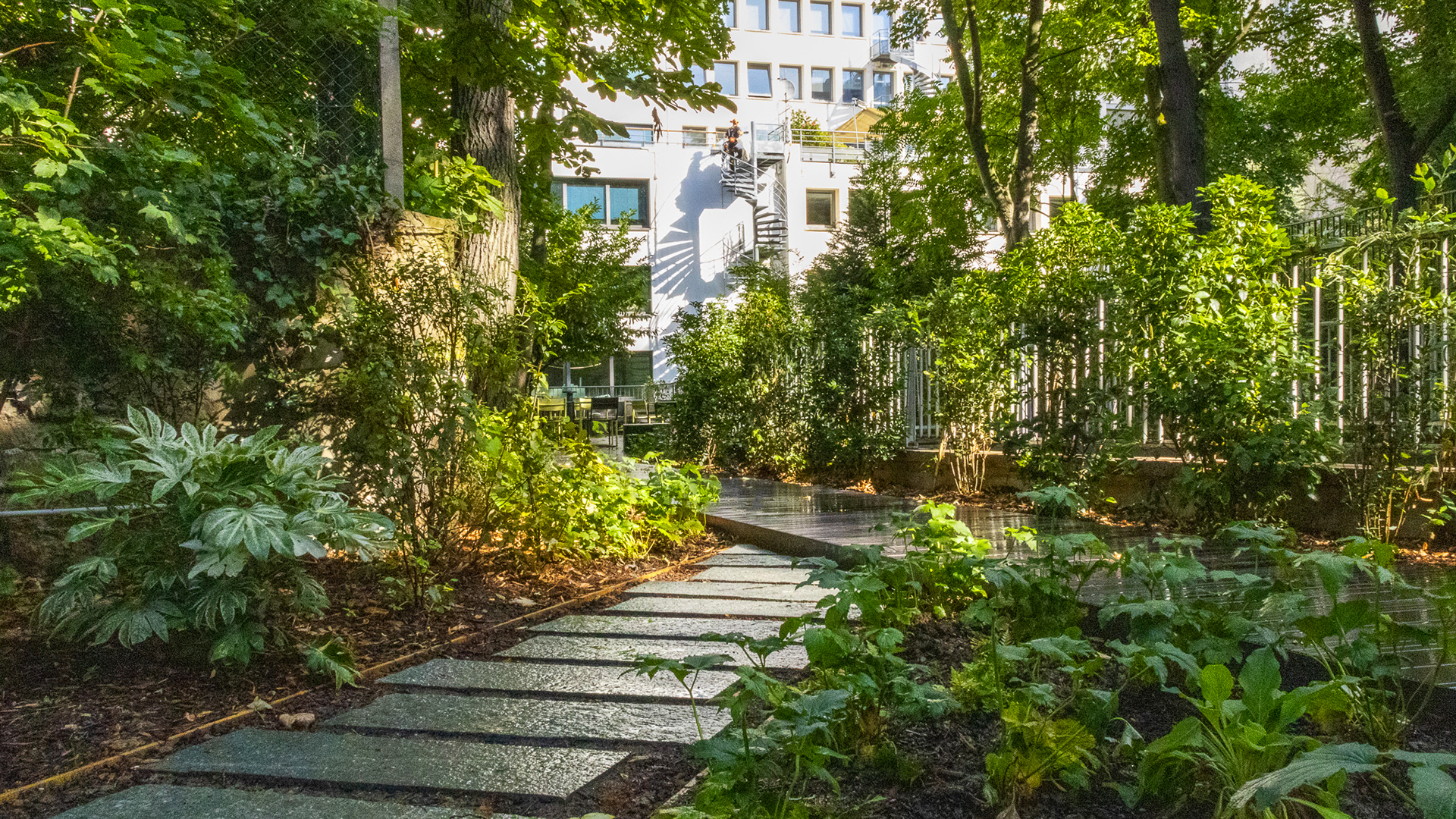 Rénovation des jardins de cœur d’ilot au 26 rue de Berri, dans un site classé Espace vert protégé avec ré-adressage de l’ensemble immobilier côté jardin avec création d’un escalier ouvert sur la ruelle.