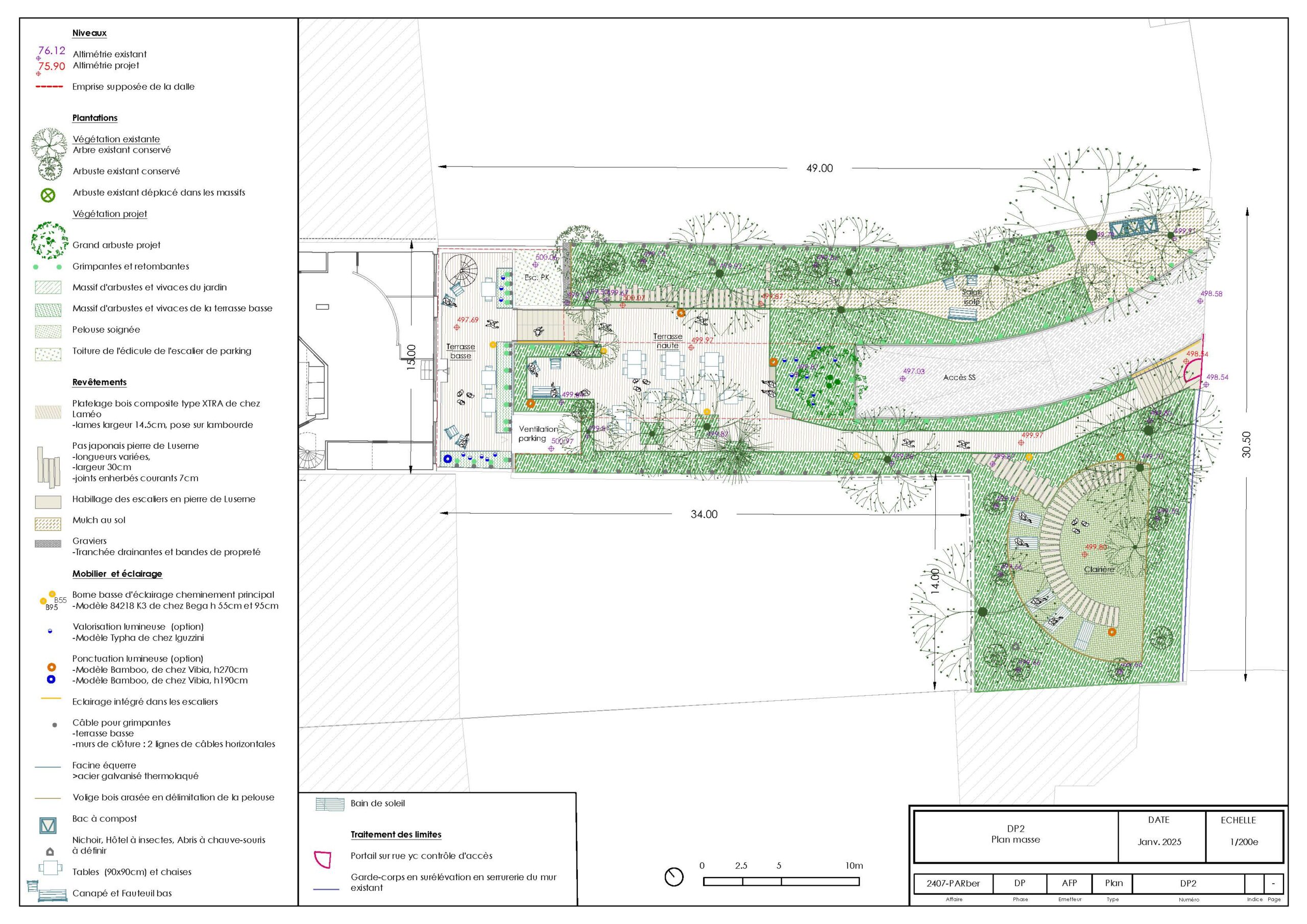 Conservation des arbres existants, replantation des 4 strates : couvre sol, vivace, strate arbustive/grimpantes et strate arborée intermédiaire. Escamotage de la rampe d’accès parking par un ensemble de grimpantes et d’arbustes, traitement des héberges, installation d’une terrasse à double niveau, mise en place de mobilier en bille de bois brut et balisage des allées.